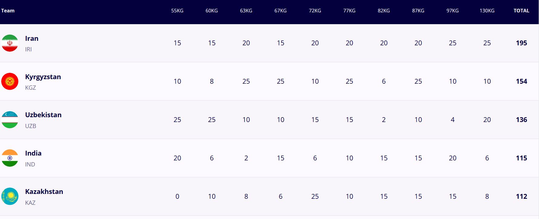 Сборная Кыргызстана заняла второе общекомандное место, уступив иранцам. На третьем — спортсмены из Узбекистана.
