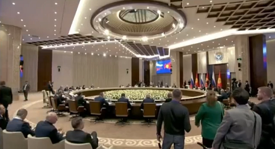 После рапорта командира роты караула прозвучали гимны Кыргызстана и России. Лидеры обошли строй военнослужащих. В этот момент Владимир Путин обратился к караулу на кыргызском языке, поприветствовав их словами: «Салам, аскер!».