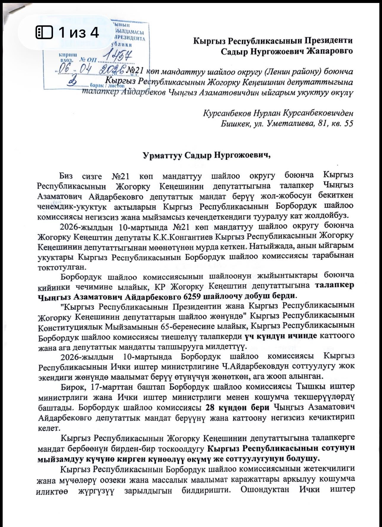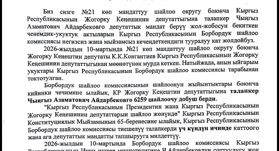 Как указано в обращении, после досрочного сложения мандата депутатом Куванычбеком Конгантиевым именно Чингиз Айдарбеков, набравший 6 тысяч 259 голосов, должен был получить депутатский мандат.