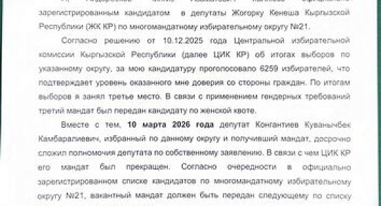 «С 10 марта 2026 года я являюсь официально кандидатом в депутаты ЖК КР 8-го созыва. За мою кандидатуру на выборах проголосовали 6 тысяч 259 избирателей, что подтверждает уровень оказанного мне доверия», — отметил Чингиз Айдарбеков.