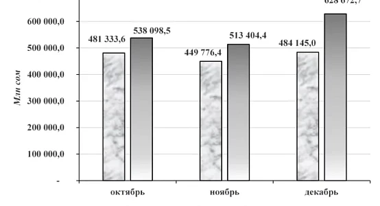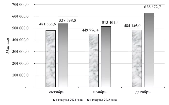 В IV квартале 2025 года в кассы коммерческих банков в целом по республике поступило 1 680 175,6 млн сом, по сравнению с IV кварталом 2024 года увеличилось на 264 920,6 млн сом, или на 18,7 процента.