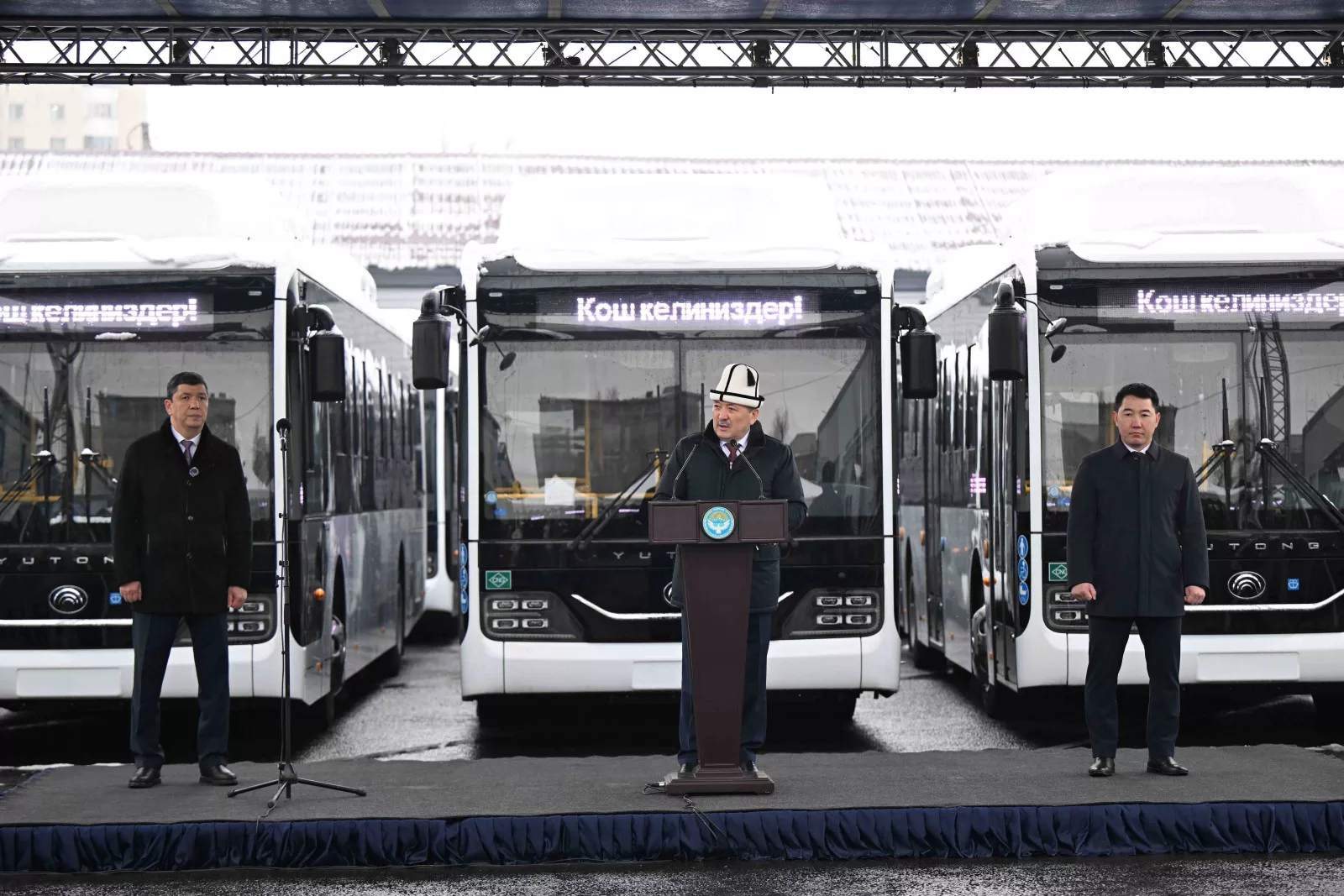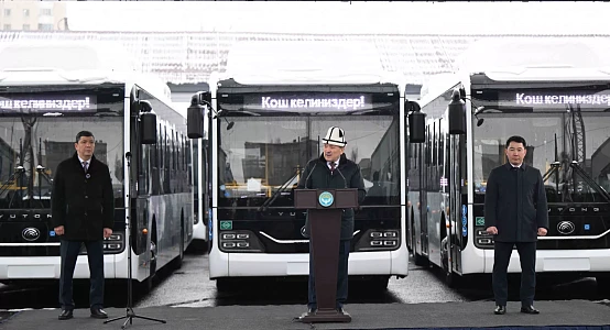 «Сегодня мы передаем мэрии Бишкека 95 новых современных автобусов, а также 42 единицы специальной техники. Это ещё один важный шаг в обновлении общественного транспорта и городских служб. В рамках последовательной работы мэрии города Бишкек приоритетом остаются развитие города, улучшение экологической обстановки и создание комфортных условий для жителей. В целях улучшения экологии высажено более 17 тысяч деревьев, расширены зелёные зоны. Начал свою работу современный экотехнологический завод по утилизации твердых бытовых отходов и выработке электроэнергии.