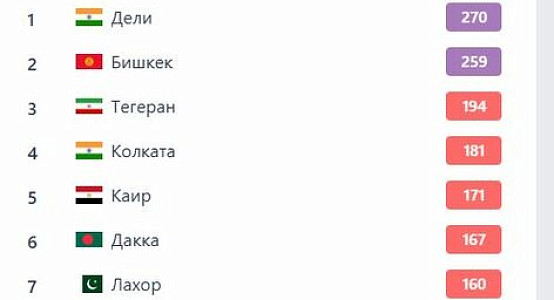 Бишкек. 23 декабря. КирТАГ – В рейтинге крупнейших городов мира по качеству воздуха World Air Quality на 17.45 Бишкек находится на втором месте.