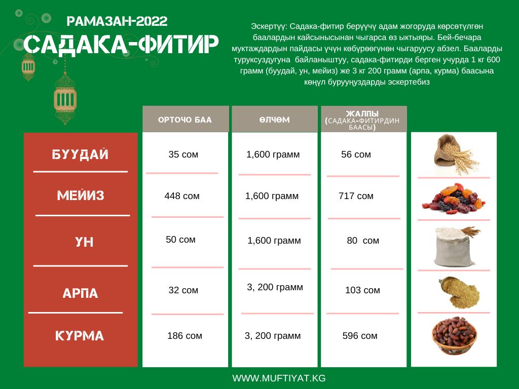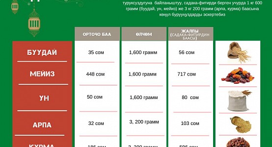 На сегодняшний день средняя стоимость 1,6 кг пшеницы составляет 35 сомов, размер пожертвования - 56 сомов; муки – 50 сомов, размер пожертвования - 80 сомов; изюма – 448 сомов, размер пожертвования - 717 сомов; ячменя - 32 сомов, размер пожертвования - 103 сома; хурмы - 186 сомов, размер пожертвования - 596 сомов.