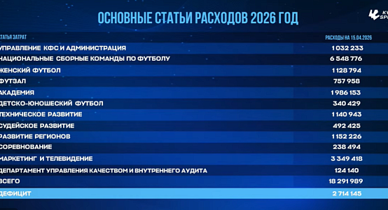 Бишкек, 15 апреля, КирТАГ — Доходная часть бюджета Кыргызского футбольного союза в 2026 году утверждена в размере $15 миллионов 577 тысяч. Об этом стало известно сегодня на конгрессе организации.