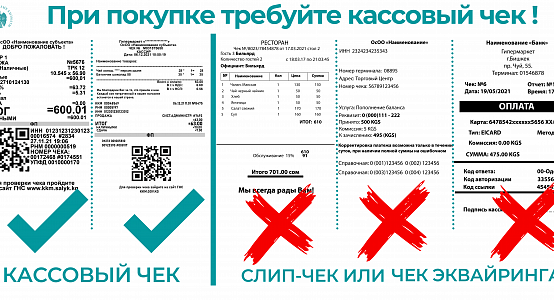 Бишкек. 2 февраля. КирТАГ - Государственная налоговая служба при Министерстве финансов КР призывает граждан при покупке товаров или получении услуг требовать кассовый чек, сообщает пресс-служба ведомства.