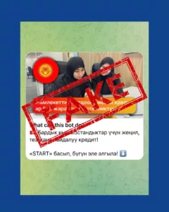 Бишкек. 18 ноября. КирТАГ – Неизвестные лица посредством мессенджера Telegram распространяют рекламу, обещая гражданам оказать содействие в получении государственного льготного кредита по выгодным условиям.