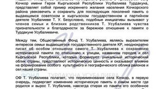 «Переименование Кочкора, напротив, приведет к изменению исторического облика района и утрате его культурно-географического значения. Турдакун Усубалиев неоднократно подчеркивал важность бережного отношения к историческим названиям и топонимам», — говорится в обращении.