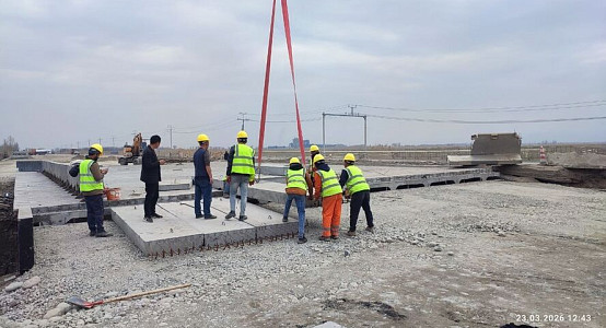 На текущий момент завершен монтаж пролетных плит на мосту через реку Нооруз. На мосту через канал выполнены работы по установке опорных конструкций, ведется подготовка к выравниванию дорожного основания.
